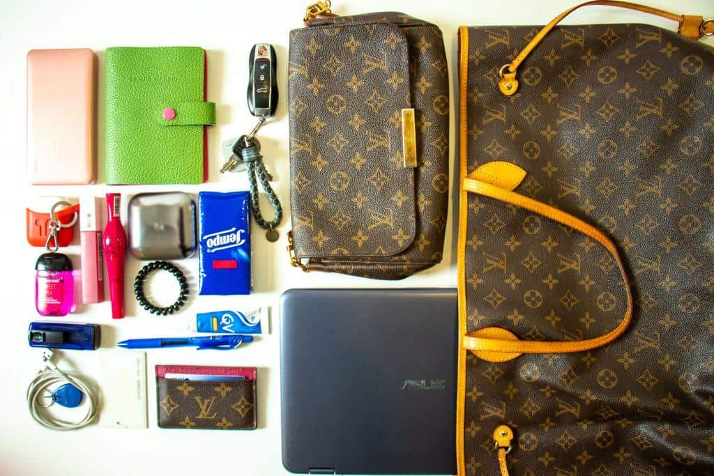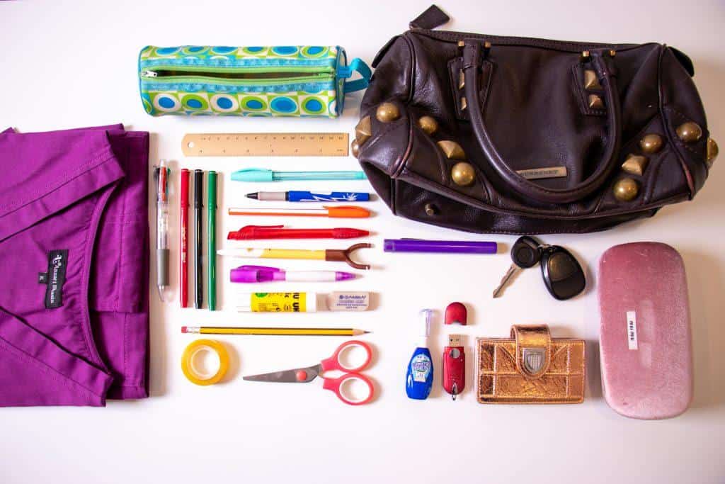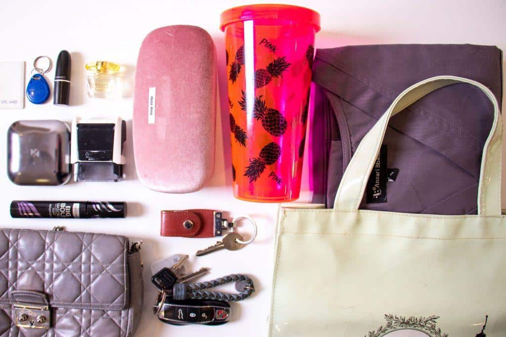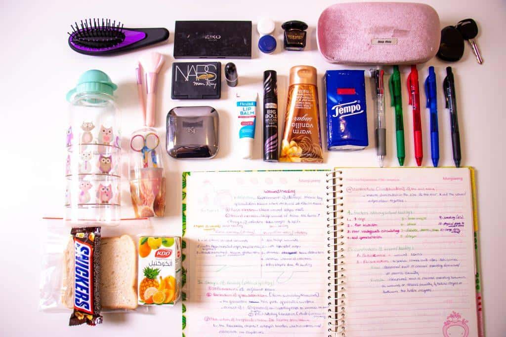 كانت هذي الحقيبة مكونه من محفظتي و كل ما يخص المحفظة، مفاتيح السيارة، نظارات شمسيه، قنينه ماء، وجبه غداء خفيفة، أقلام ملونه، محارم ورقيه، علج أو اللبان، مستحضرات تجميل بسيطة، مرآة صغيره، كريم لليدين، عطر، علبة عدسات، عدة أظافر صغيره، دفتر مدوناتي.